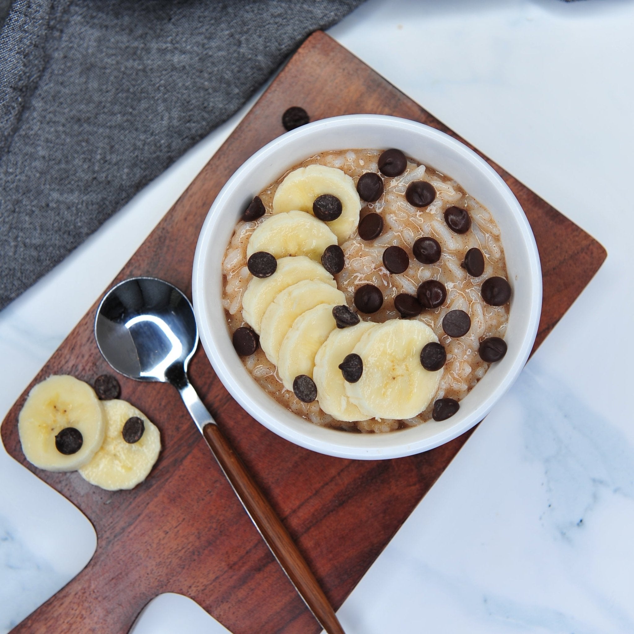 In a small bowl, mix Angel Food Cake protein, water and cinnamon/sugar substitute to make a pudding. Add brown rice to protein pudding and stir until well combined. Garnish with sliced banana and chocolate chips and enjoy!