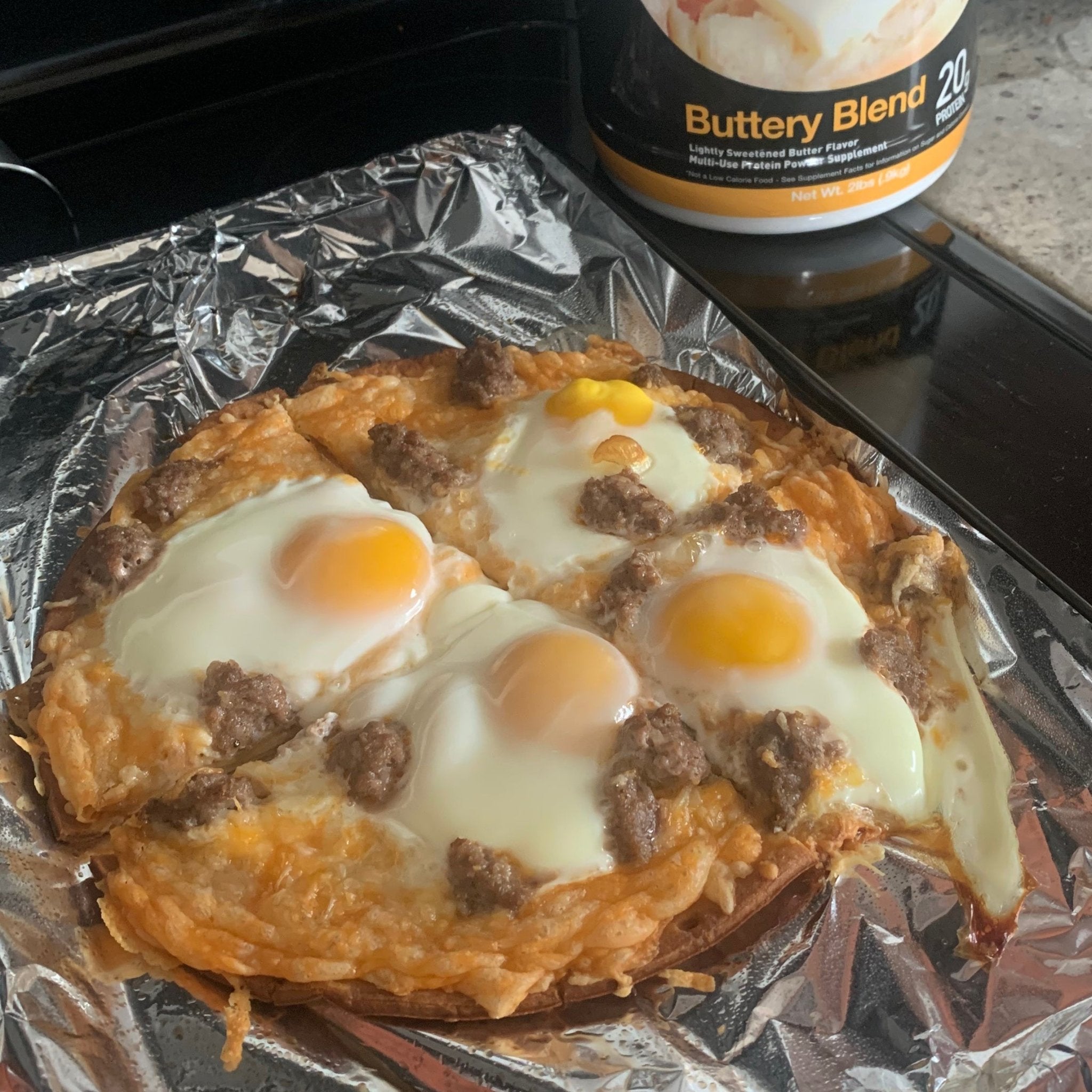 Brush pizza crust with olive oil and add shredded cheese, bacon or sausage pieces if desired, 4 whole eggs and top with fresh parmesan cheese. Bake an additional 8-12 minutes at 425 degrees.