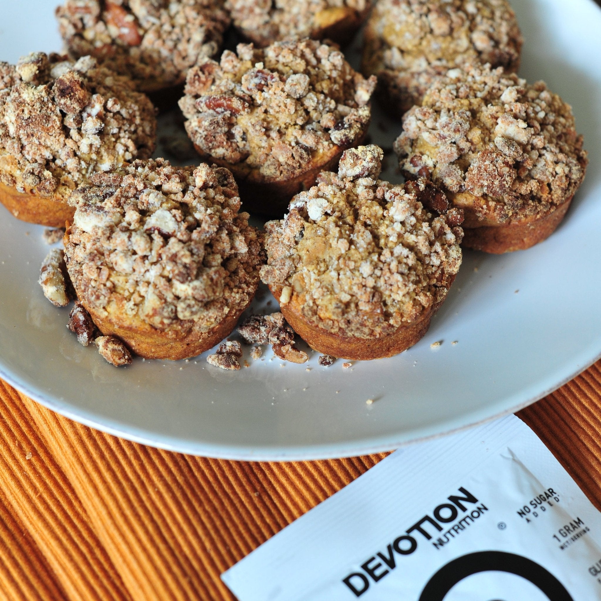 In a medium sized sauce pan, melt the coconut oil over medium heat. Add pecans and brown sugar replacement, stirring frequently until melted together. Reduct heat to low and sprinkle in Buttery Blend protein, and cinnamon. Continue stirring until it forms a nice crumbly texture.