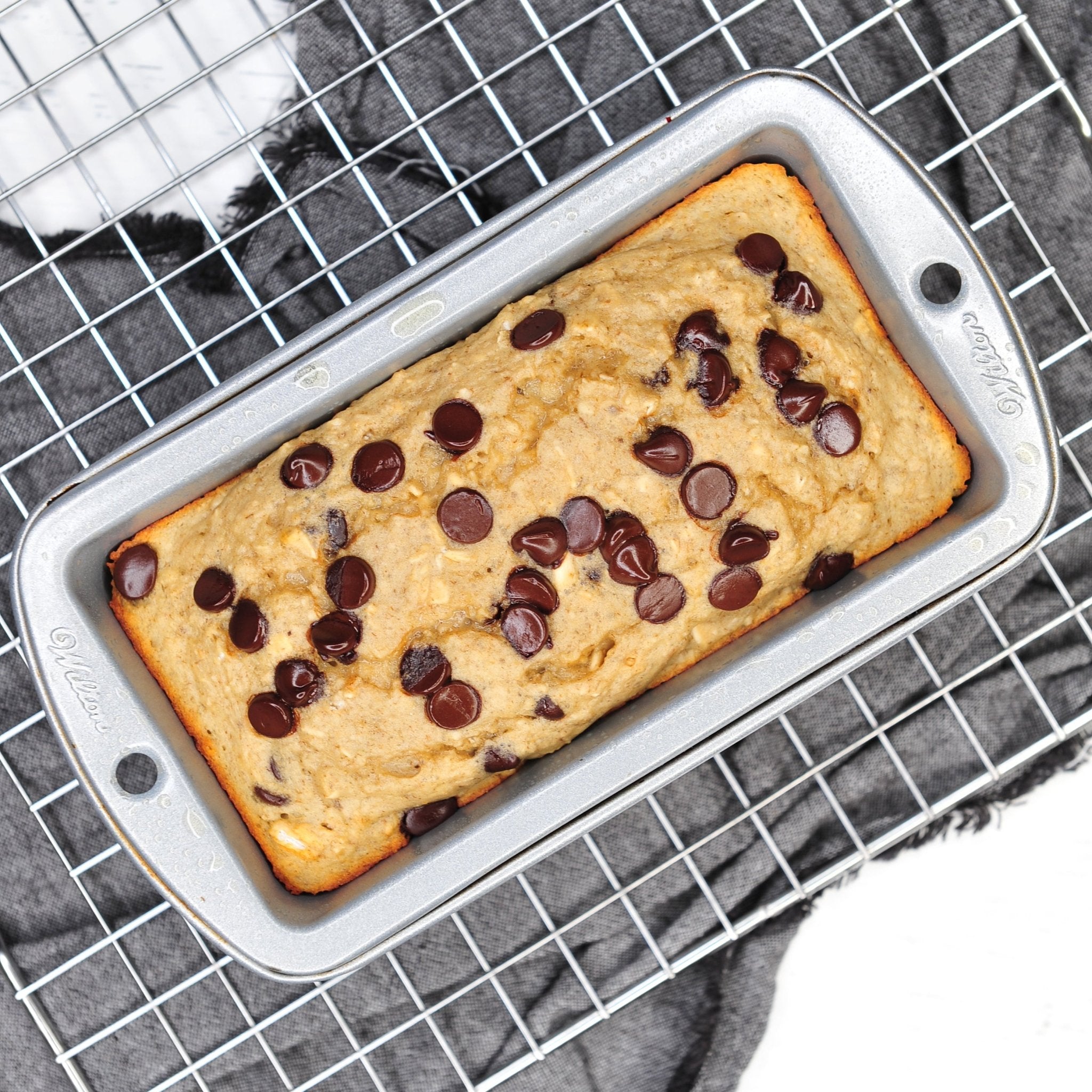 - In a blender, add bananas and wet ingredients. Pulse/Blend until well combined. In a large bowl, add all dry ingredients and mix well. Add wet to dry and stir until all ingredients are moistened. Blend in chocolate chips. Pour into prepared pan.