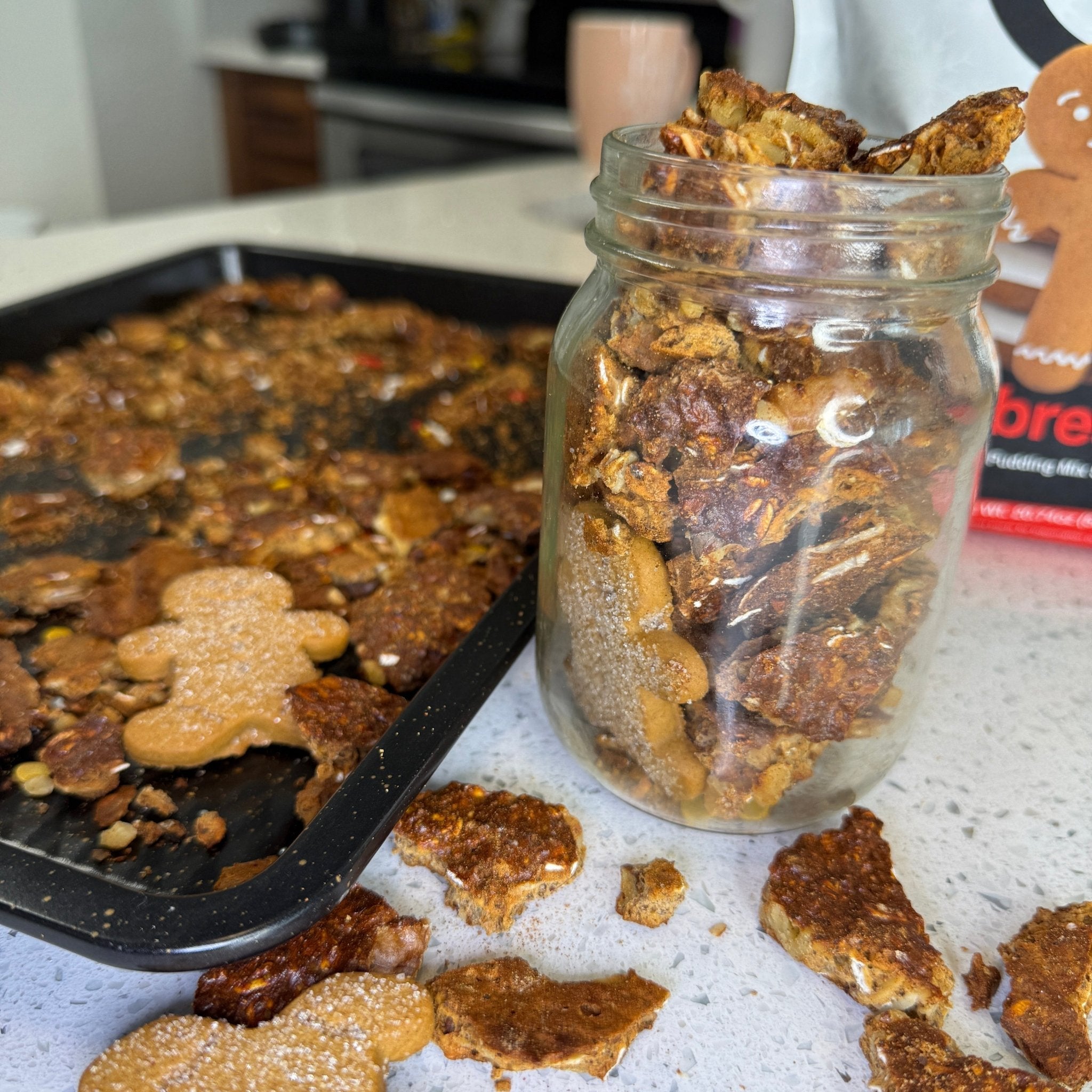 In a large mixing bowl, mix flour, baking powder, protein powder, ginger, cloves, cinnamon and salt. In a separate bowl beat coconut oil and brown sugar substitute for about 3 minutes.⠀