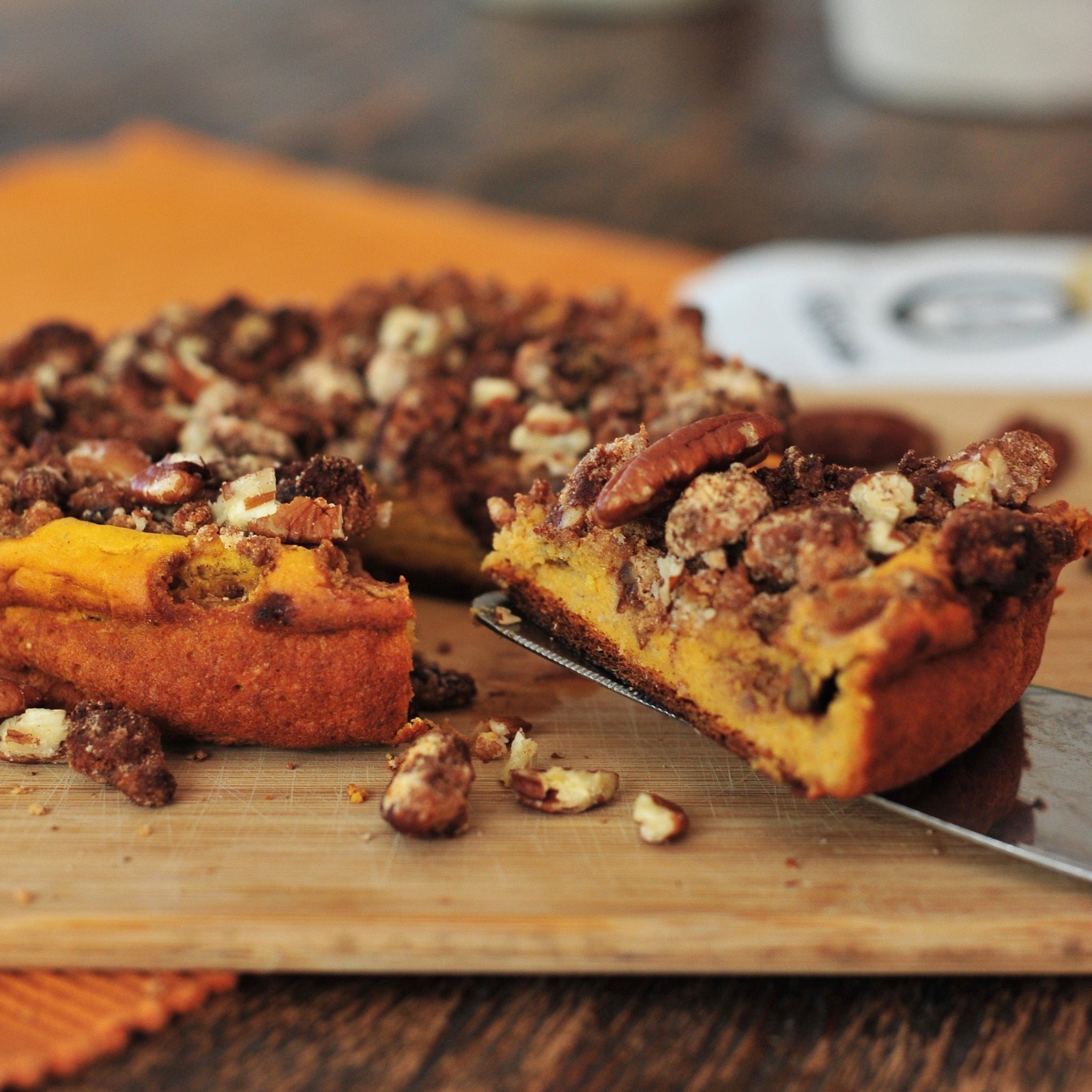 Prepare crumble: In a medium sized sauce pan, melt the coconut oil over medium heat. Add pecans and brown sugar replacement, stirring frequently until melted together. Reduct heat to low and sprinkle in Buttery Blend protein, and cinnamon. Continue stirring until it forms a nice crumbly texture.