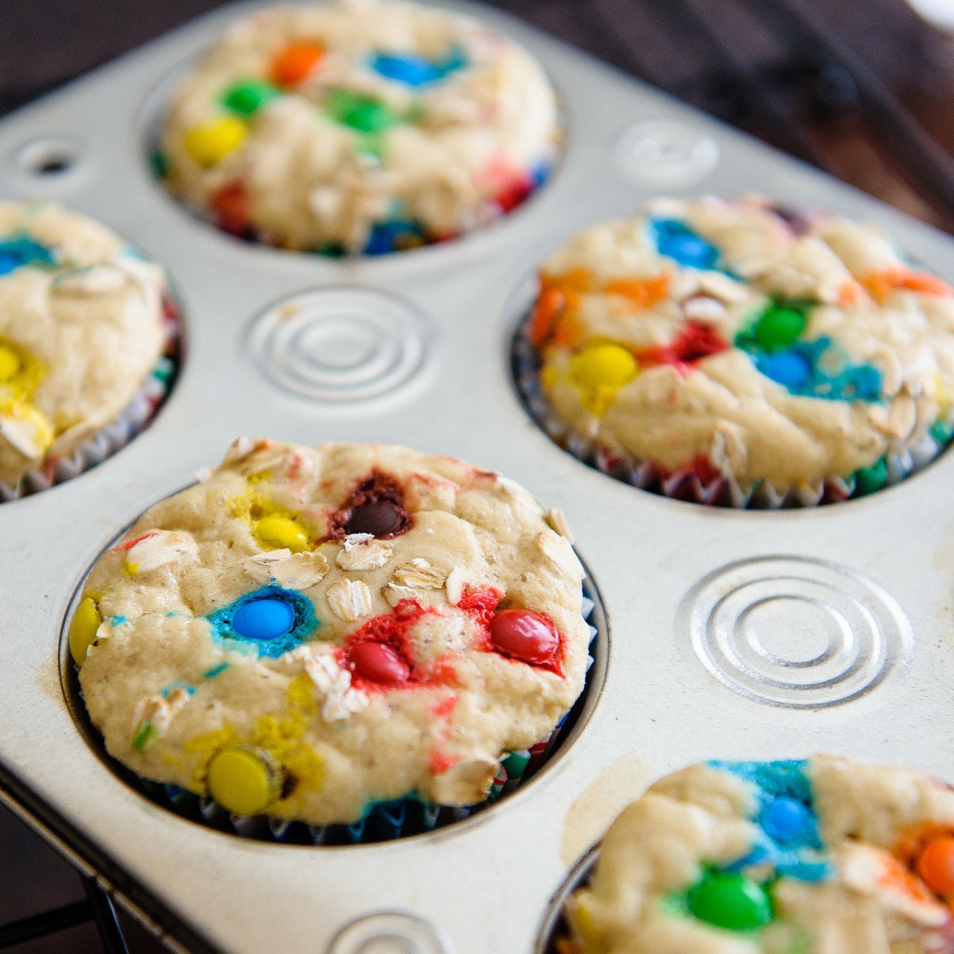 In a small bowl, mix together dry ingredients and set aside. In a separate bowl, whisk together liquids until well blended. Add dry ingredients to liquids and mix well. Quickly pour into prepared pan and sprinkle with oats and candies if desired.