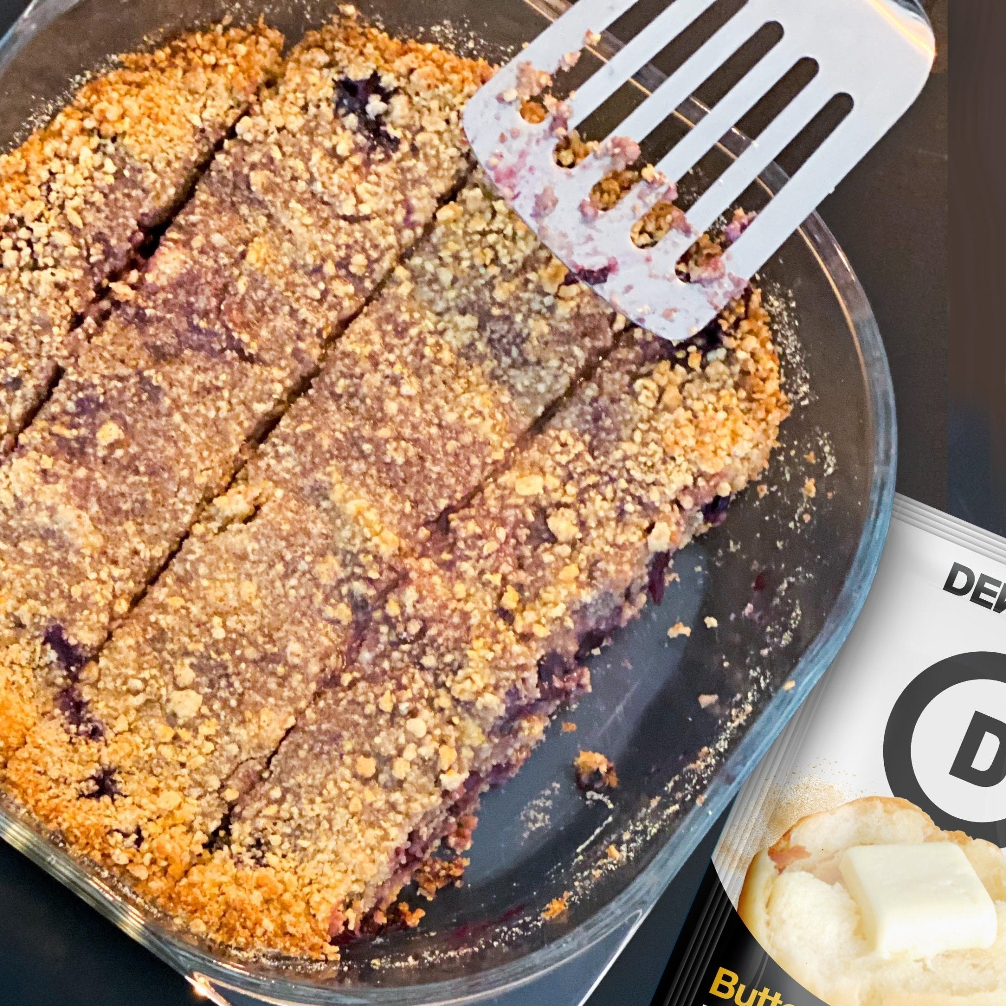 - In a pre-sprayed brownie pan, pat half of the crumb mixture into the bottom of the pan. Spread filling evenly over top of the crumb crust. Sprinkle the remaining crumb mixture on top of the filling until all is covered.
