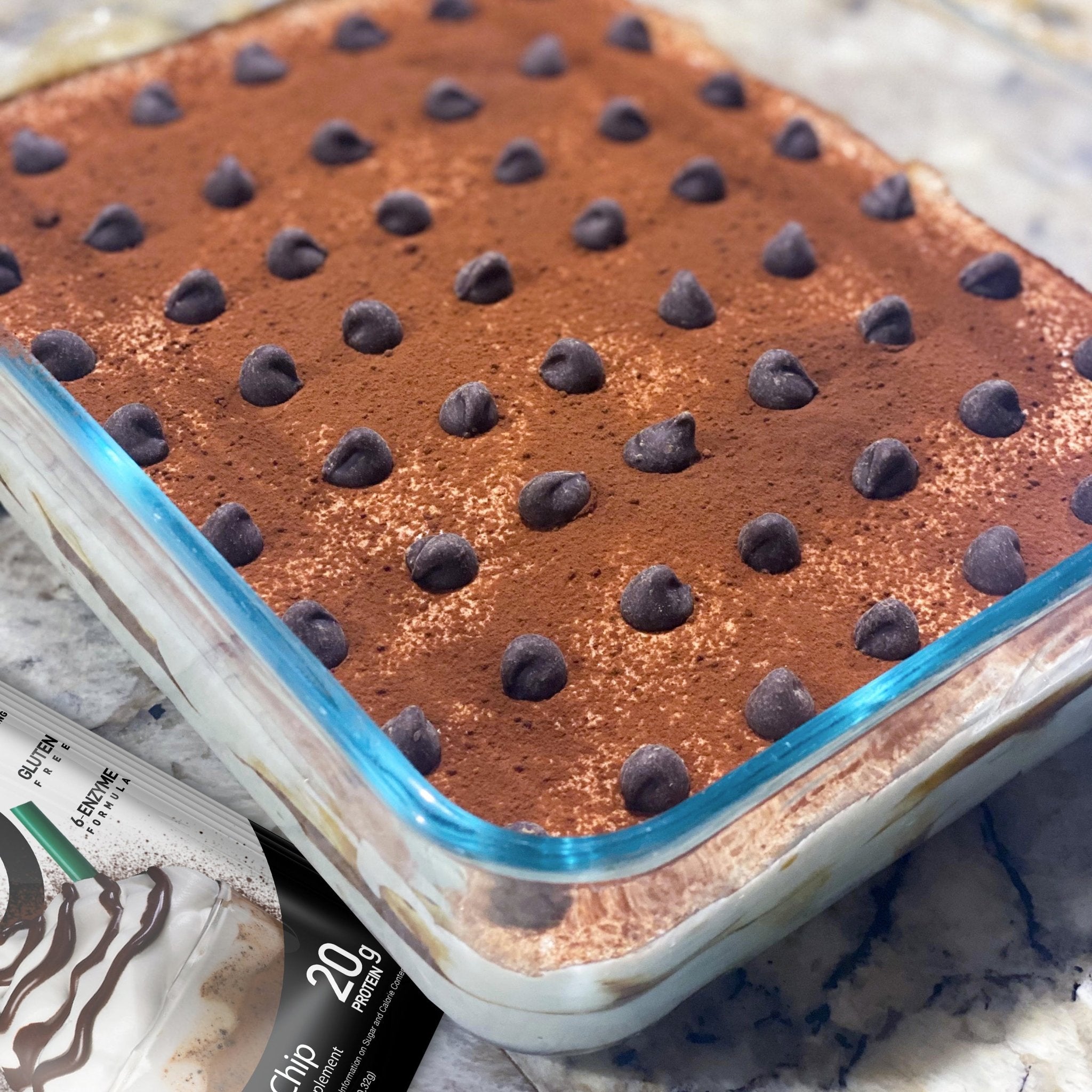 - Dust cocoa powder and top with chocolate chips. Refrigerate for several hours to allow cheese/pudding mixture to set and tiramisu to chill.