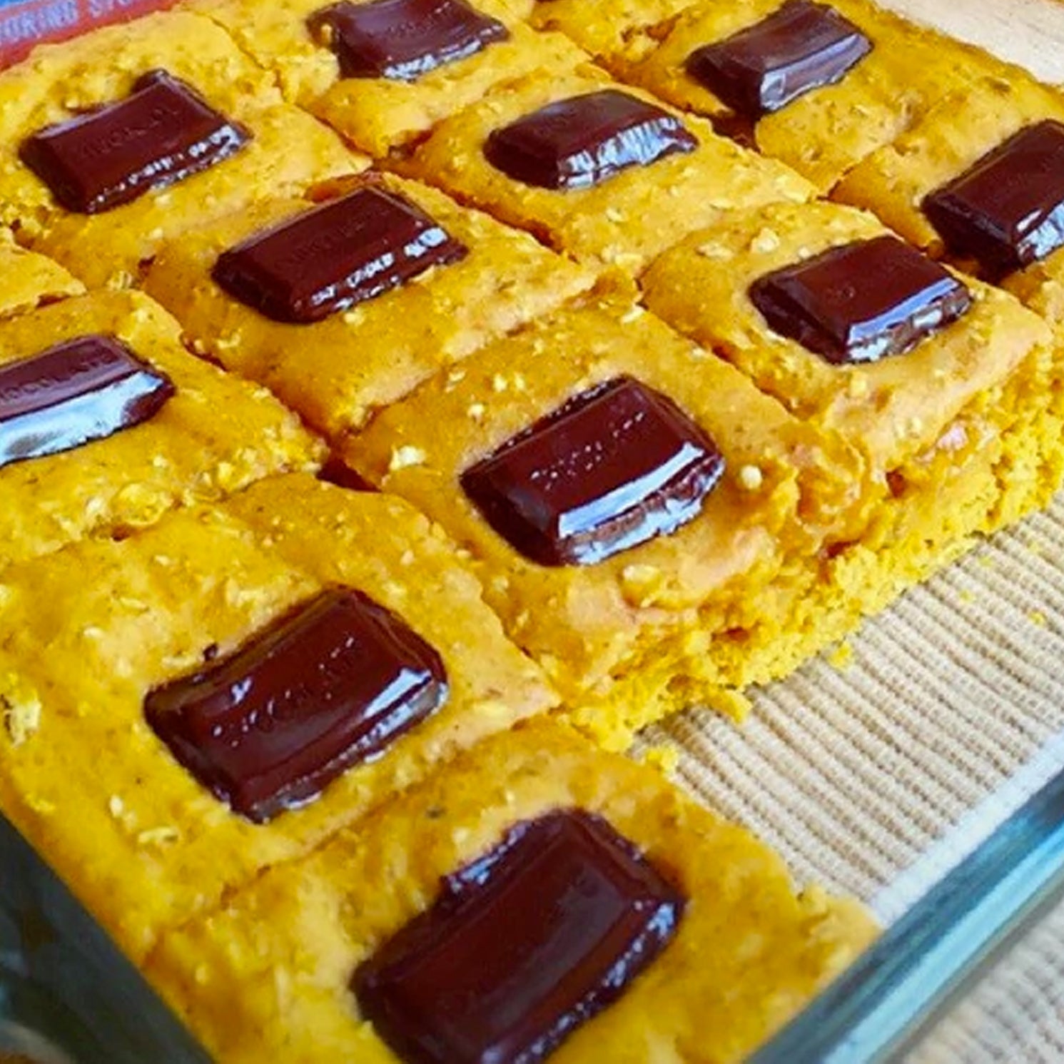 Combine wet and dry ingredients separately (do not mix chocolate chunks, reserve for topping). Add dry ingredients to wet. Mix well, pour into a square baking dish (sprayed with non-stick cooking spray). Spread batter evenly, and place chocolate pieces evenly over the top, so that each square bar will have a chocolate piece on top.