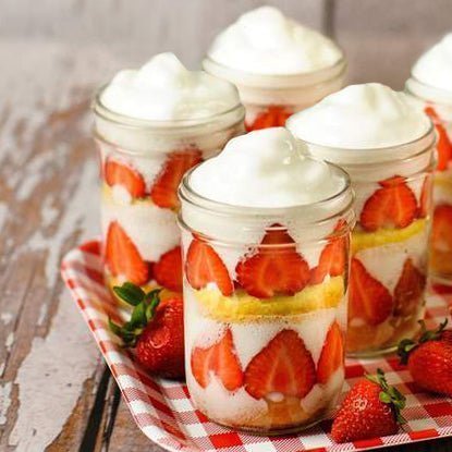 Blend reserved scoop Devotion Nutrition Angel Food Cake Protein Powder with 1 Cup water and 2 Cups ice to make protein fluff. Divide half of fluff between jars and arrange top halves of cakes on top. Place remaining strawberry slices in jars, top with remaining fluff and serve.