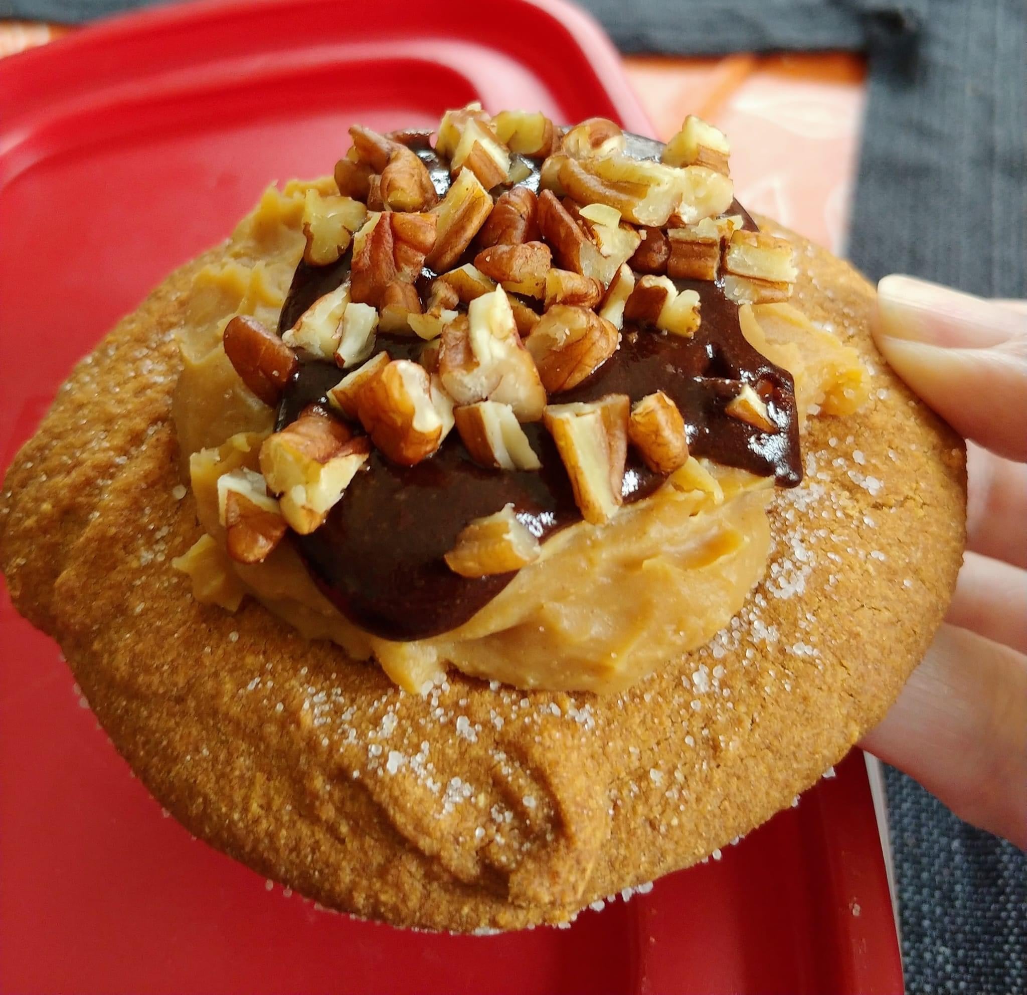 Assemble toppings on cooled cookie base. Top with nuts and granulated sweetener, if desired. This cookie is best assembled and then refrigerated. Enjoy!