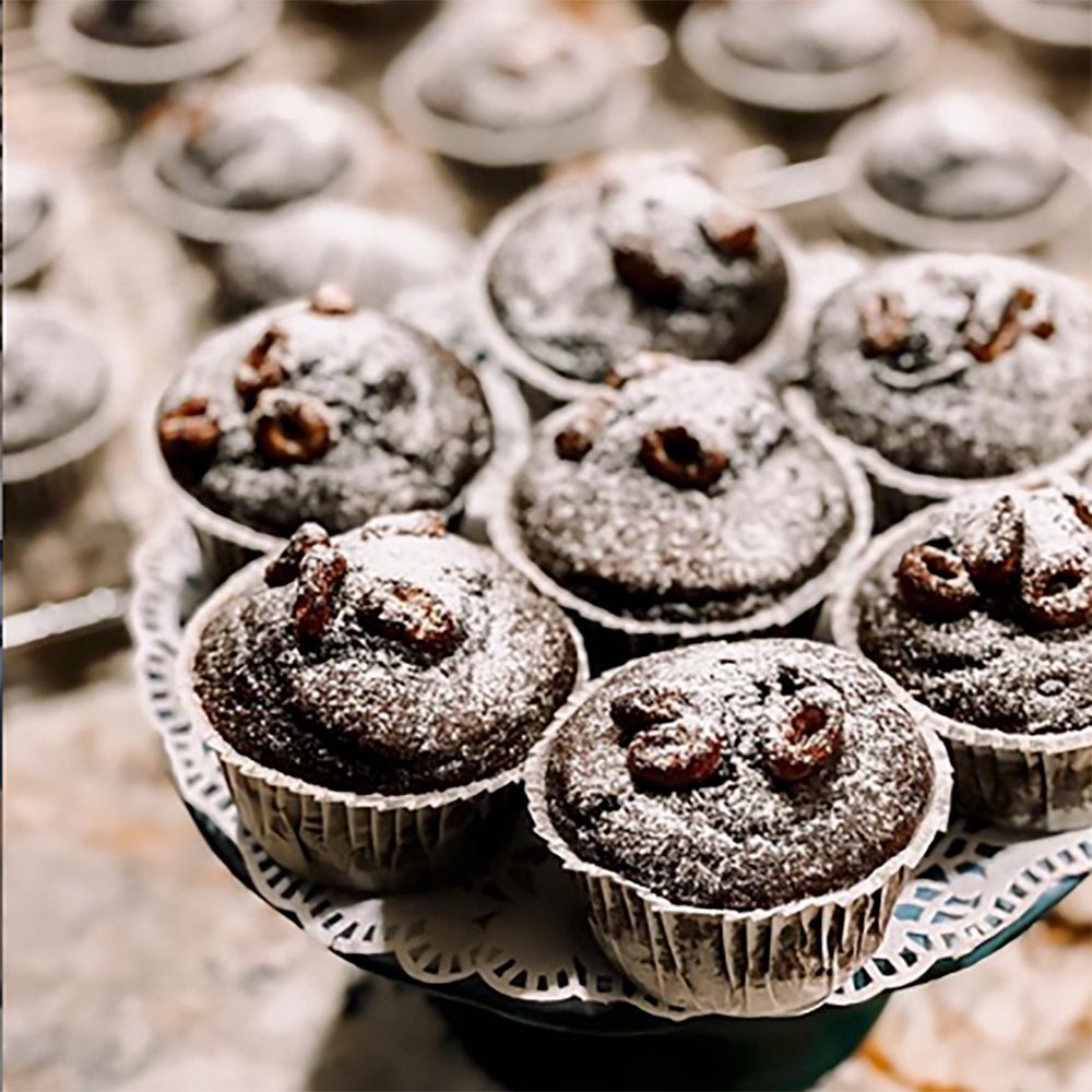 Whisk the dry and wet ingredients in two separate bowls. Pour wet into dry ingredients and mix until well blend but do not over mix. Pour batter into muffin pan (pretreated with cooking spray) or use foil liners and top with walnuts, if desired.