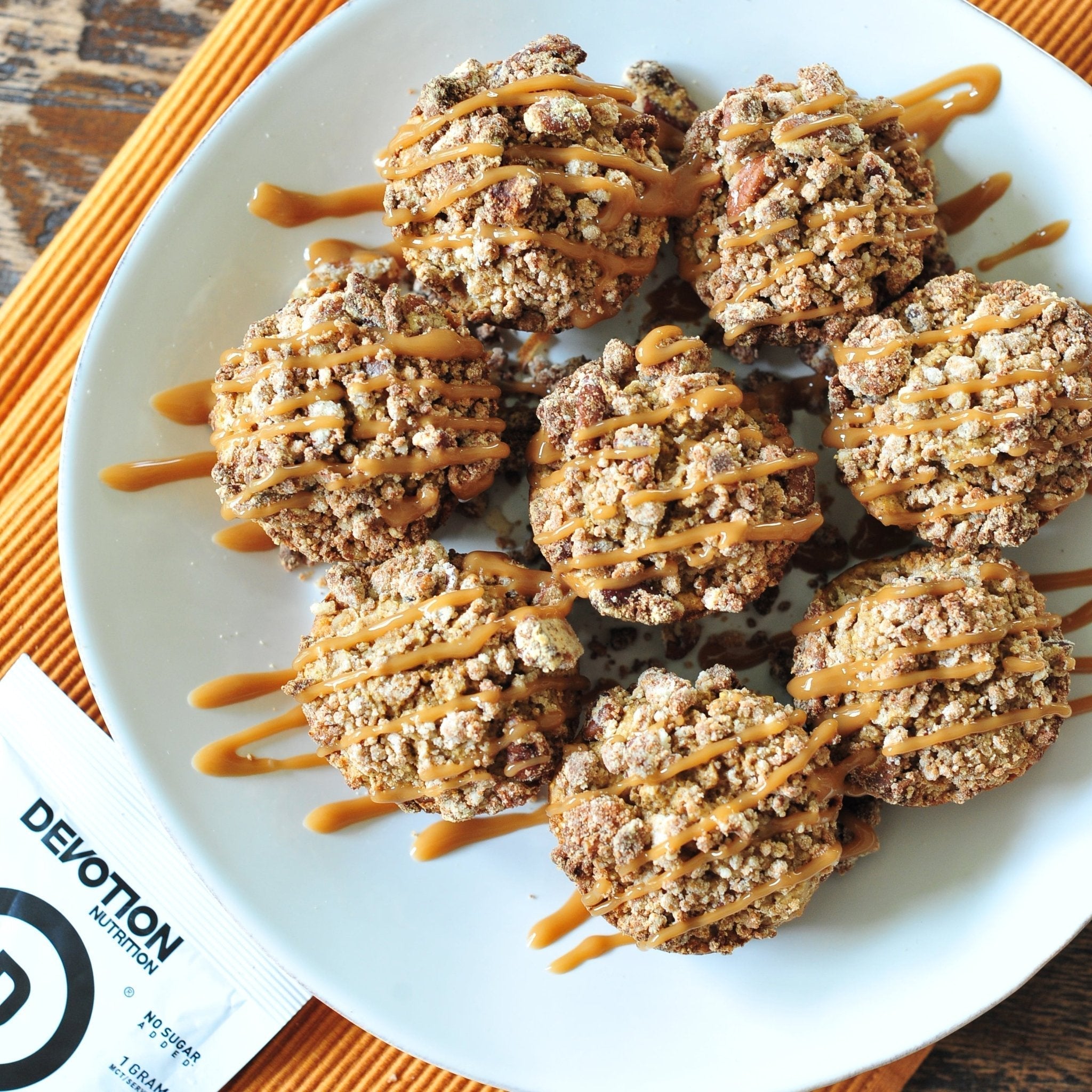 PROTEIN PECAN CRUMBLE RECIPE CAN BE FOUND HERE. Simple prepare crumble and spoon over batter prior to baking!