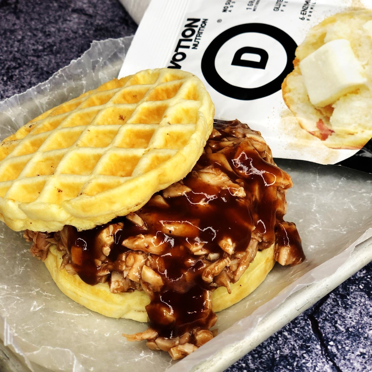 We used 3 oz pre-cooked rotisserie chicken blended with 2 tablespoons sugar-free BBQ sauce to fill our sandwiches. De-bone and shred or chop and mix with sauce. Feel free to top with additional BBQ if desired and adjust macros accordingly. 2 waffles = 1 servingMacros for the waffles only: 110 calories// fat 1.5g// carbs 4g// protein 20g// sugar 0g Macros for the ENTIRE SANDWICH: 290 calories// fat 13g// carbs 7g// protein 35g// sugar 1g
