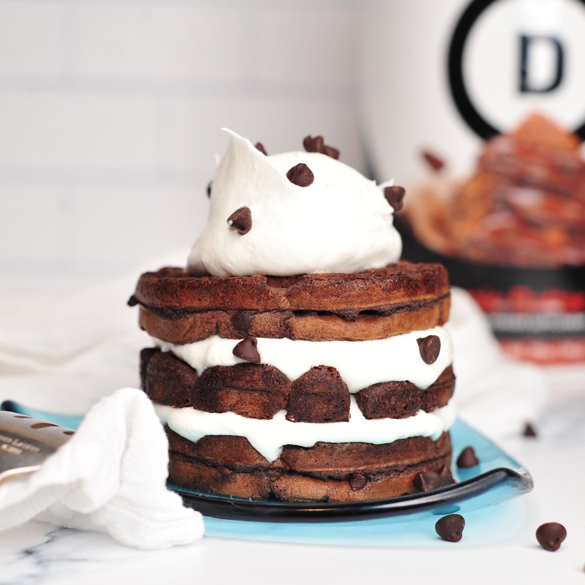Preheat waffle iron of choice. Whisk wet ingredients in a small mixing bowl and then add dry ingredients and mix until well blended. Spray waffle iron with non-stick spray immediately prior to adding approximately one tablespoon of batter to avoid scorching. Let the waffle iron work but remove promptly. Layer with sugar-free whip topping if desired and enjoy!!Macros will vary depending milk choice. You can also make these with egg whites to make more macro friendly.