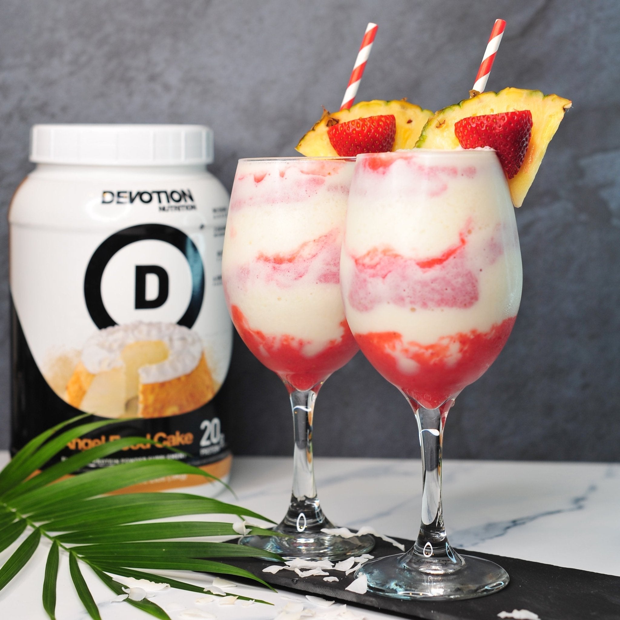 Next, in a blender or food processor, add wet and frozen ingredients and pulse a few times. Then add Devotion Angel Food Cake protein powder and blend on high until desired consistency is reached. Layer strawberry puree with frozen colada mixture into tall glass and garnish with pineapple wedge if desired.