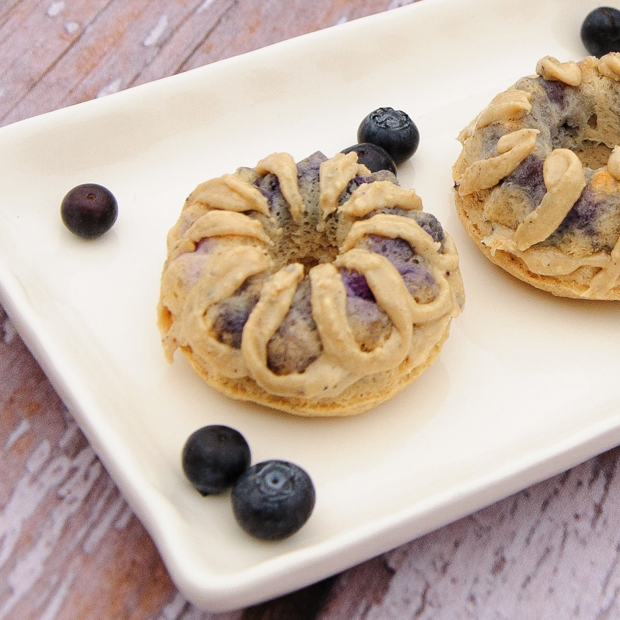 Preheat oven to 350. Apply non-stick spray/oil to 6 cavities of mini (2.75-3” across) bundt pans. If using a silicone baking pan (recommended), place on a firm baking sheet.In a small bowl, mix together dry ingredients and set aside. In a separate bowl, whisk liquids into nut butter until well-blended. Add dry ingredients to liquids and mix well. Pour into prepared pans. Evenly space 6 blueberries on top of the batter in each cup. Gently push each blueberry under the batter to the bottom of the molds. Bake until cooked through, approximately 18 minutes.Remove from oven and place on wire rack to cool for several minutes. Carefully unmold bundts from pan and allow to cool. If desired, spread nut butter on tops while still warm so that nut butter gets melty and drips down the sides of the bundts. May be served warm or cool, but should be stored in refrigerator if not being consumed immediately.Notes: The batter from this recipe is very versatile. If desired, it can be baked in donut molds or muffin cups, or used to make delicious waffles too! For those with nut allergies, coconut flour and coconut milk can be substituted for the almond four and almond milk, and sunflower seed butter or an egg can replace the nut butter in the recipe while keeping macros nearly the same.Preheat oven to 350. Apply non-stick spray/oil to 6 cavities of mini (2.75-3” across) bundt pans. If using a silicone baking pan (recommended), place on a firm baking sheet.In a small bowl, mix together dry ingredients and set aside. In a separate bowl, whisk liquids into nut butter until well-blended. Add dry ingredients to liquids and mix well. Pour into prepared pans. Evenly space 6 blueberries on top of the batter in each cup. Gently push each blueberry under the batter to the bottom of the molds. Bake until cooked through, approximately 18 minutes.Remove from oven and place on wire rack to cool for several minutes. Carefully unmold bundts from pan and allow to cool. If desired, spread nut butter on tops while still warm so that nut butter gets melty and drips down the sides of the bundts. May be served warm or cool, but should be stored in refrigerator if not being consumed immediately.Notes: The batter from this recipe is very versatile. If desired, it can be baked in donut molds or muffin cups, or used to make delicious waffles too! For those with nut allergies, coconut flour and coconut milk can be substituted for the almond four and almond milk, and sunflower seed butter or an egg can replace the nut butter in the recipe while keeping macros nearly the same.